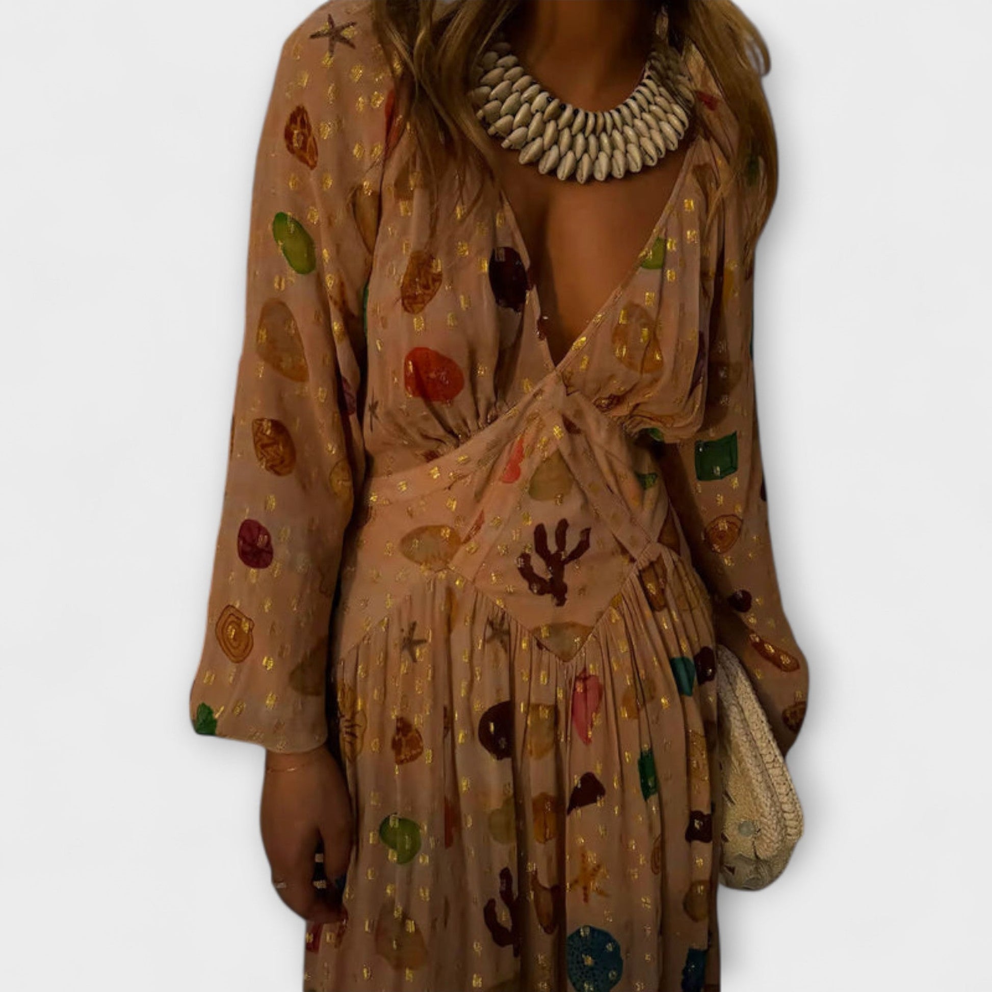 We present our stunning Shell Print Dress—a must-have for your vacation wardrobe! This eye-catching piece features gold accents and a vibrant shell design, perfectly complemented by a structured silhouette that flatters every figure.
